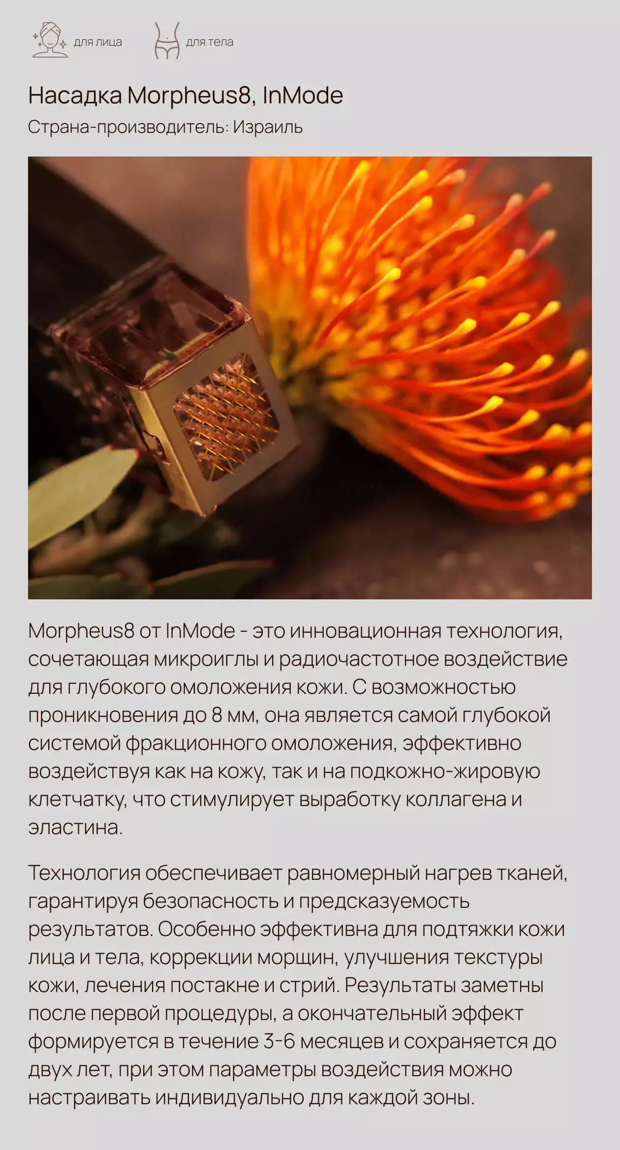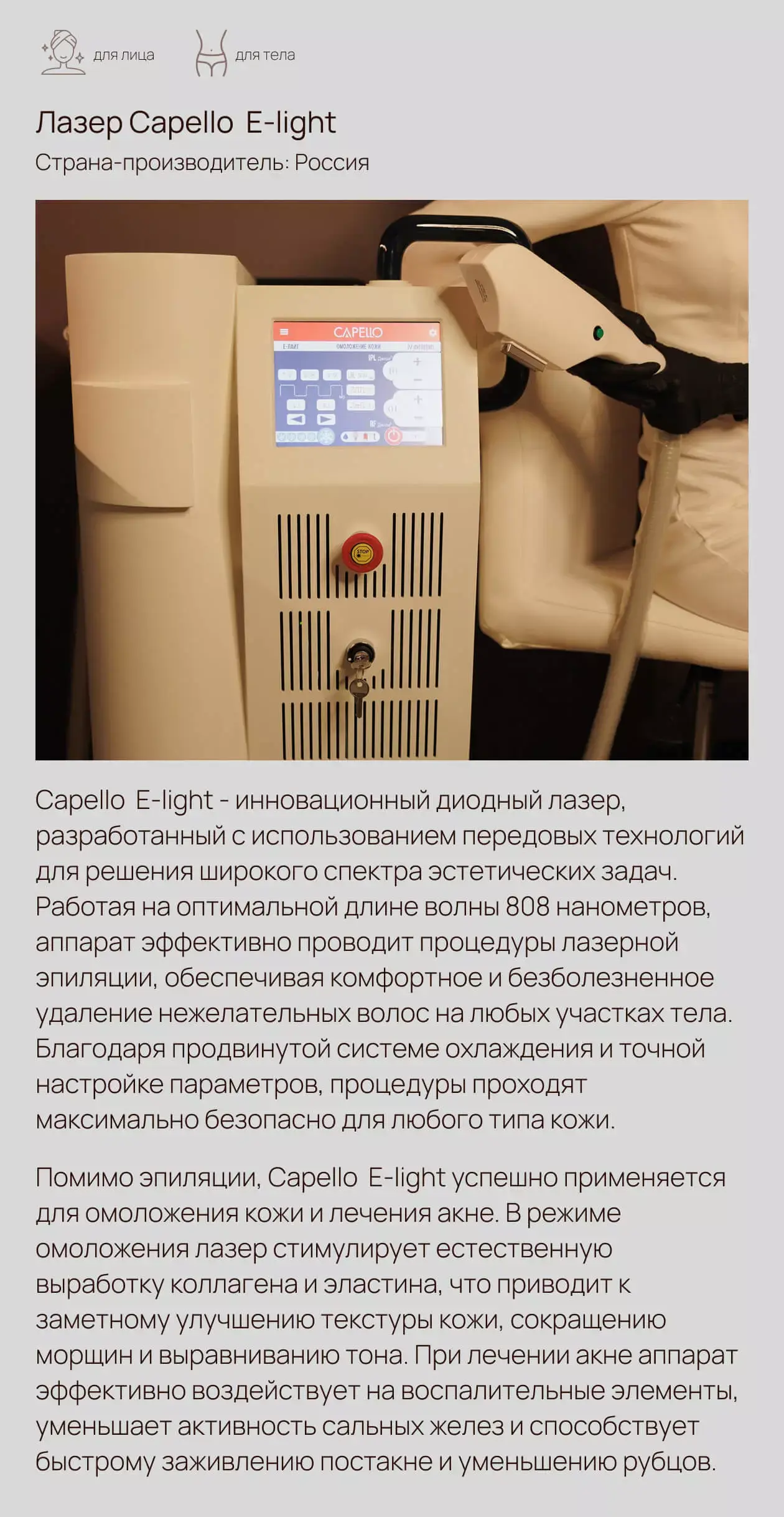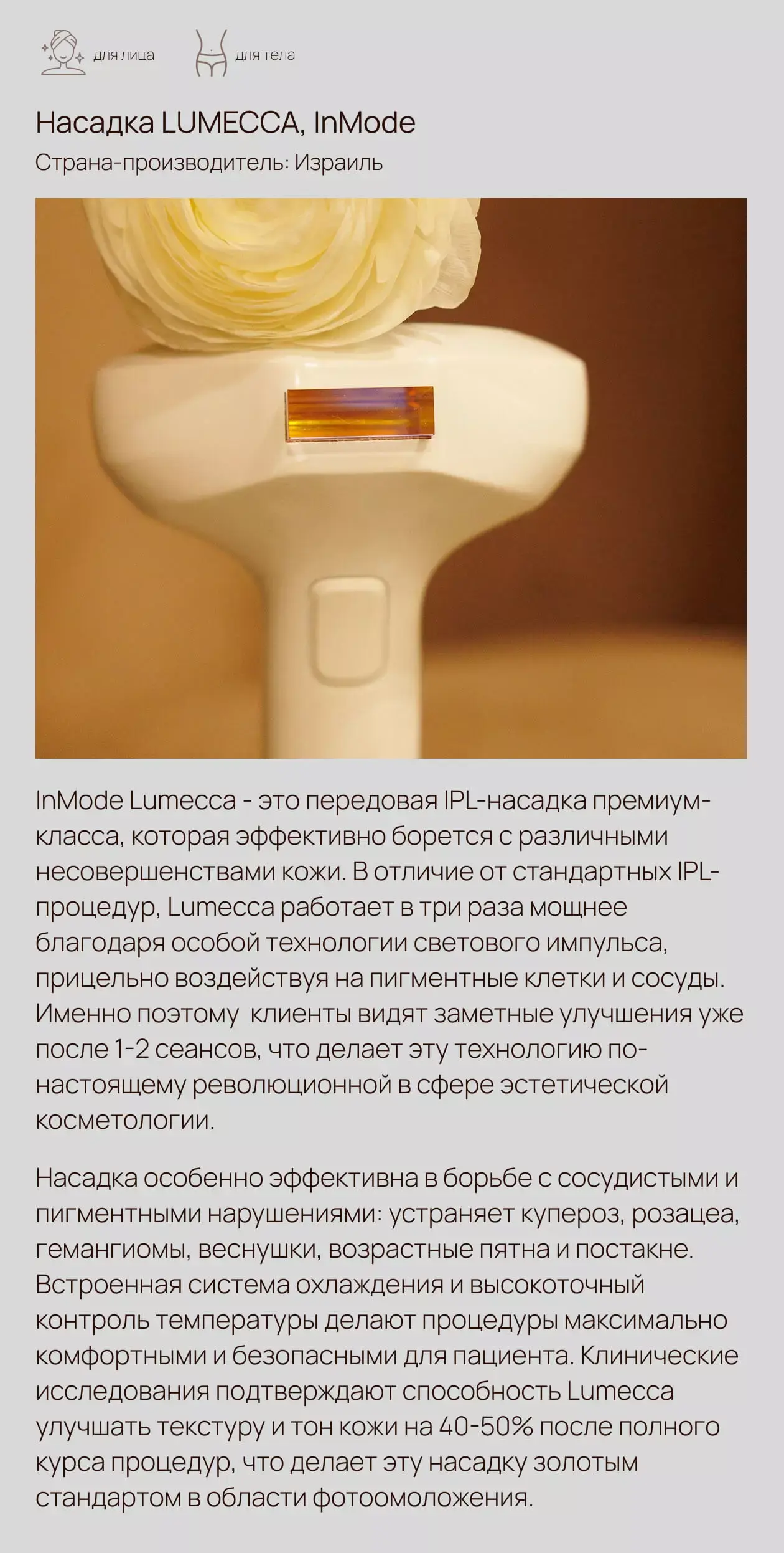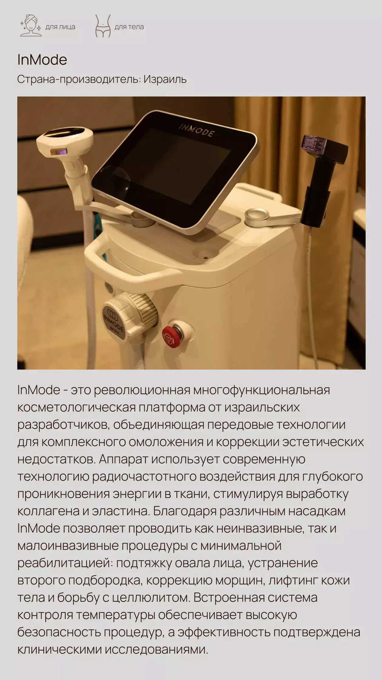 Полный спектр услуг в области эстетической и инъекционной косметологии, а также самые современные аппаратные методики на оборудовании премиум-класса InMode (LUMECCA, Morpheus8, Diolaze), Capello и ProFacial. К вашим услугам различные виды массажа, расслабляющие SPA-программы, профессиональный ногтевой сервис и экспертное оформление бровей – всё это в атмосфере безупречного комфорта и роскоши