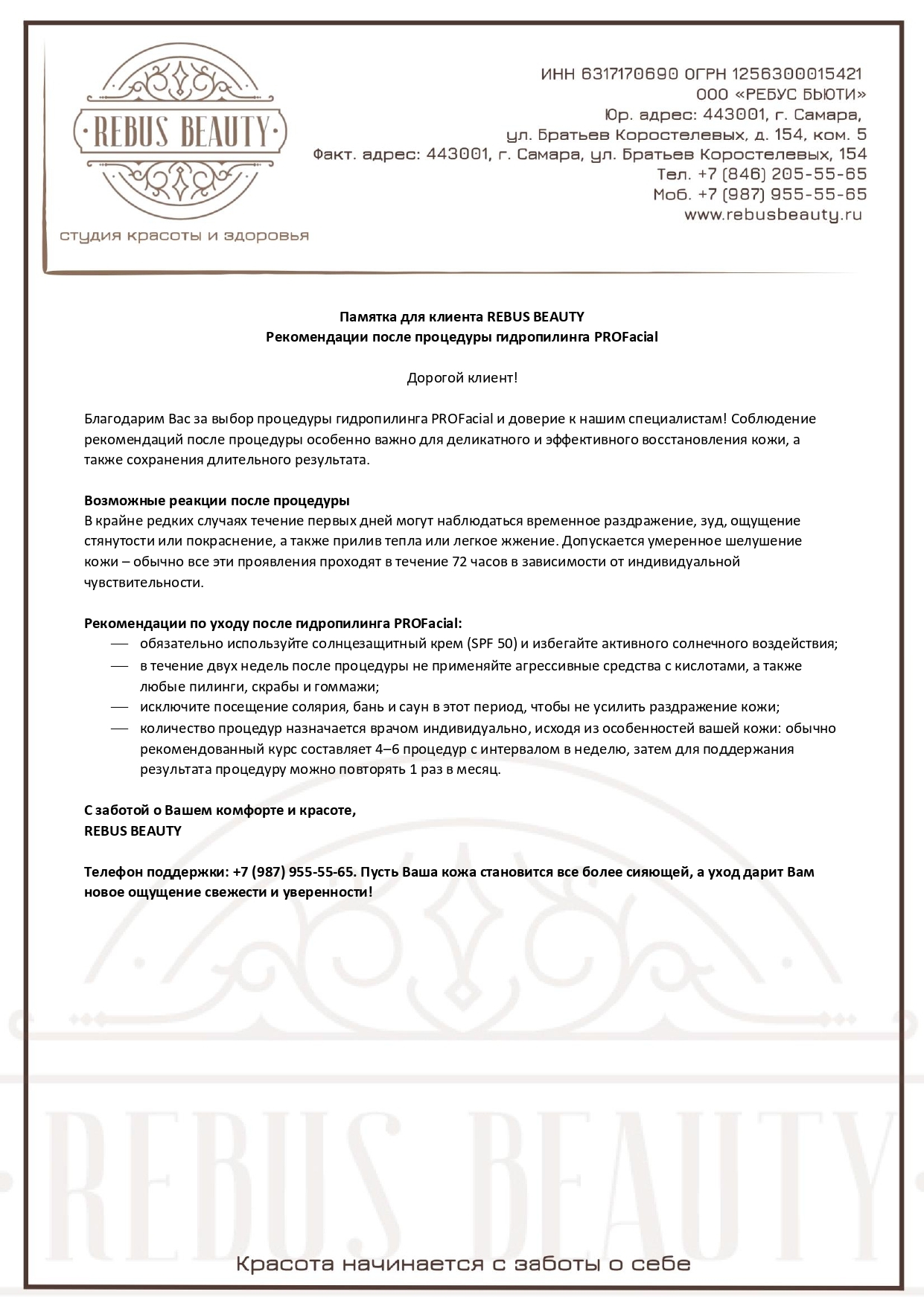 Студия красоты и здоровья REBUS BEAUTY всегда поддержит вас после процедуры — вы можете обратиться за консультацией к специалисту, если возникнут вопросы по уходу или индивидуальному подбору средств.